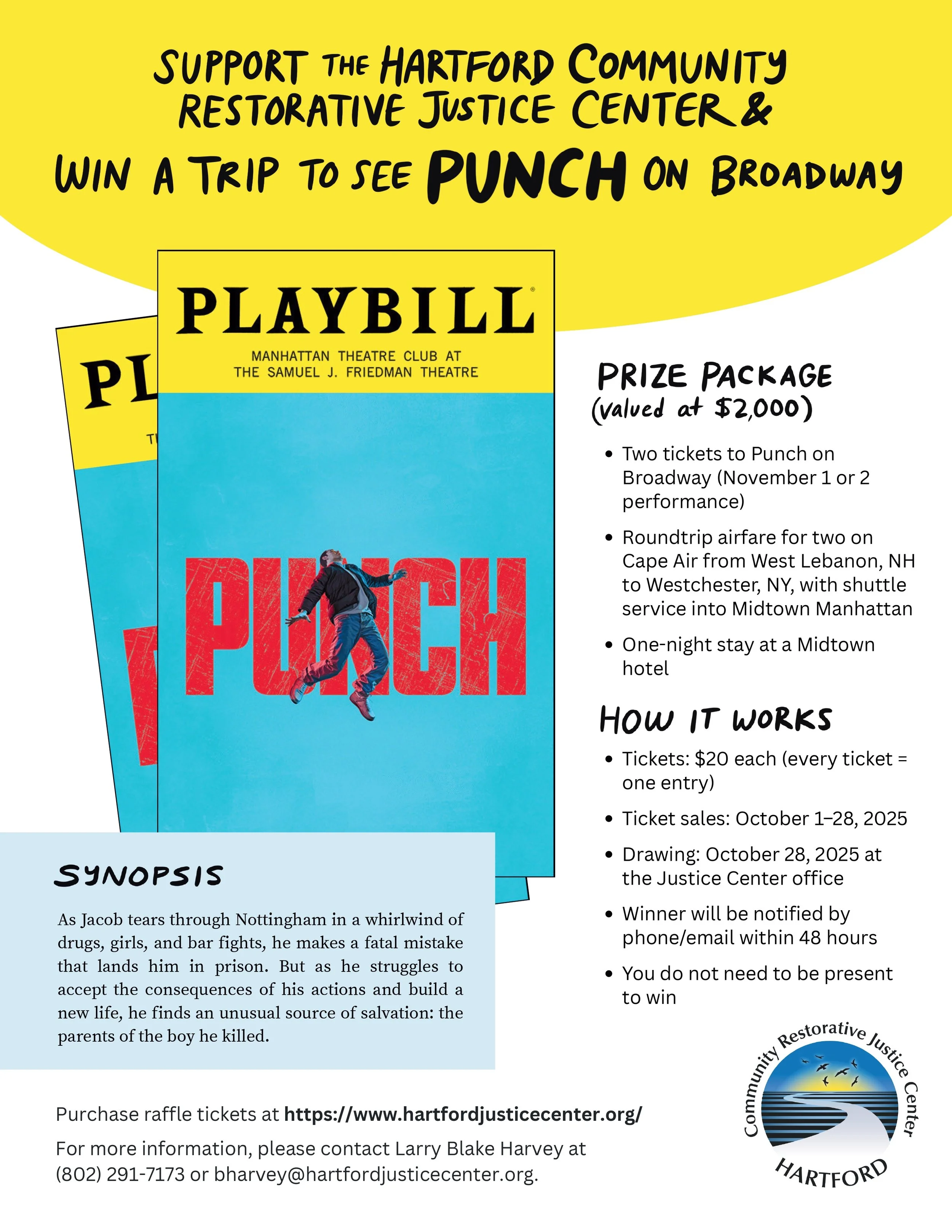 Join us for a special opportunity that connects art, justice, and community. The Hartford Community Restorative Justice Center is hosting a fall raffle inspired by Punch, a powerful new Broadway production that tells the true story of accountability and forgiveness after a single act of violence. This remarkable play captures the heart of what restorative justice is all about: helping people take responsibility, heal relationships, and rebuild lives. When you purchase a raffle ticket, you are not only entering to win a trip to New York City but also supporting the programs that make this work possible right here in the Upper Valley.